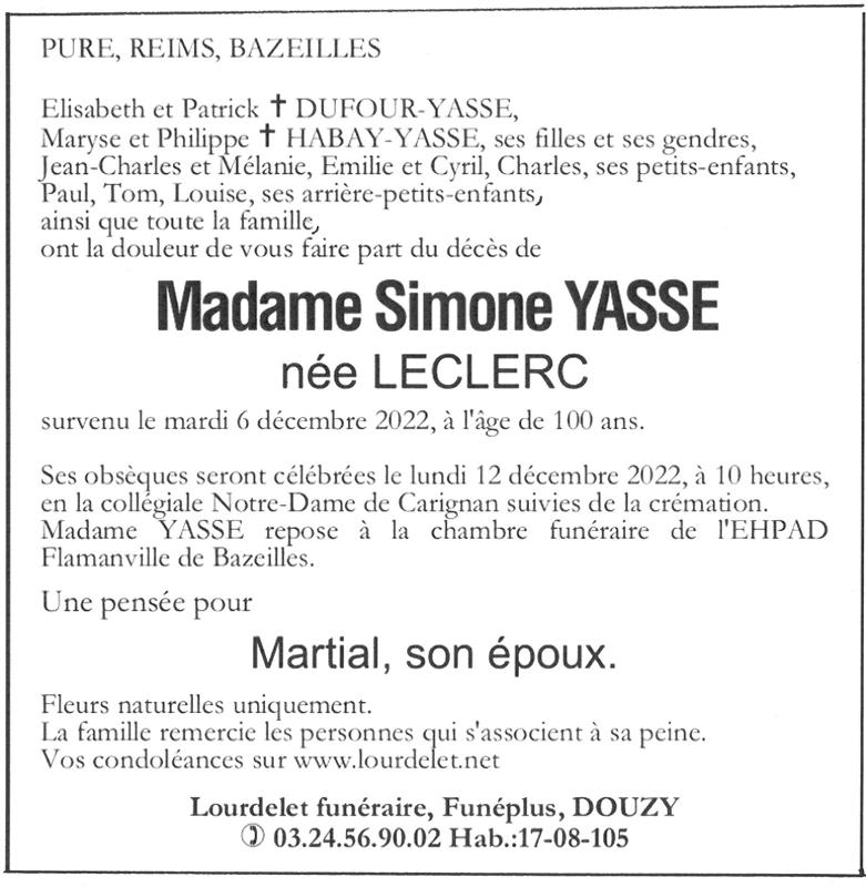 Décédée à Bazeilles (08140, France) le mardi 6 décembre 2022 à l'âge de 100 ans