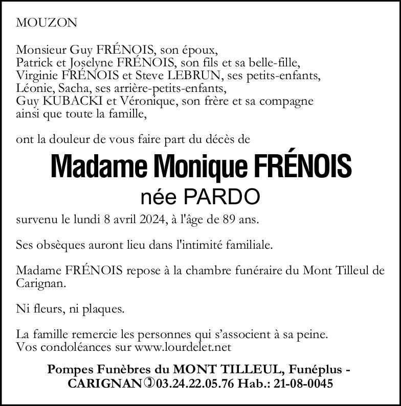 Décédée à Mouzon (08210, France) le lundi 8 avril 2024 à l'âge de 89 ans