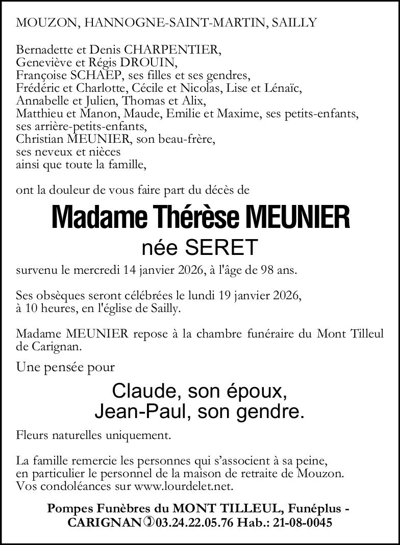 Décédée à Mouzon (08210, France) le mercredi 14 janvier 2026 à l'âge de 98 ans